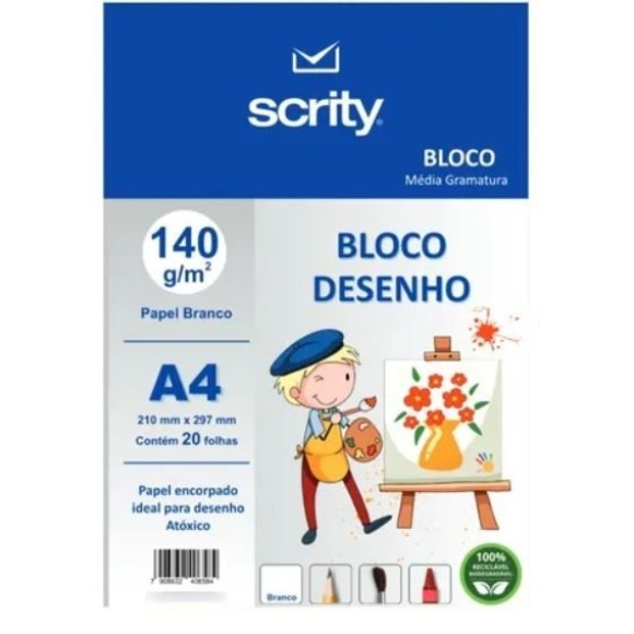 Especificação: Bloco de desenho branco / Atóxico / Formato: A4 / Medidas: 210mm x 297mm / Gramatura: 150g/m²