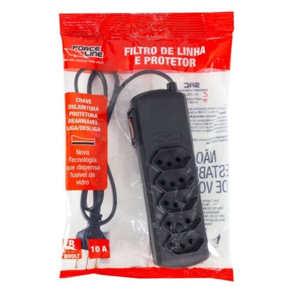 Características técnicas: Tomadas: 5 Tomadas / Comprimento do Cabo de Força: 0,8m / Tensão (Potência): 127/1270W e 220V/2200W / Corrente Máxima: 10 A / USB: Não / Cabo: PP - 3x0,75mm² / Normas: NBR NM 247-5 - CABO e NBR 14136/2002 - Plugue/Tomada / Cor: Preto / Gabinete: Plástico PP /0020 / Chave: Disjuntor Rearmável 10A com indicador luminoso de funcionamento / Proteção: Sobretensão e Atenua surtos de tensão provenientes de raios e anomalias da rede elétrica, até 125 joules (10/1000µs) de energia