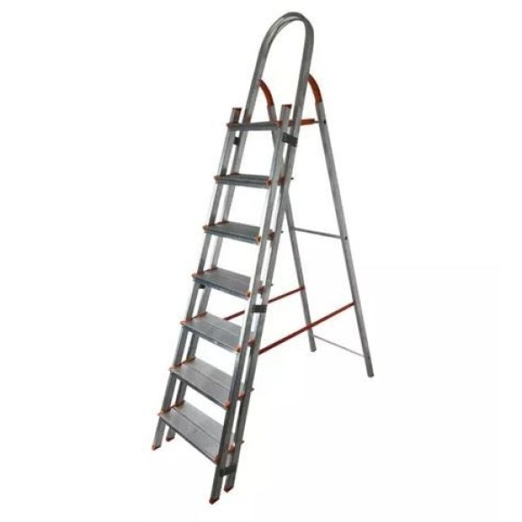 Estrutura reforçada 100% em alumínio / Patamar em polipropileno com degrau anexo / DEGRAUS DUPLOS antiderrapantes / Corrimão de apoio duplo / Fita de segurança / Produto indicado para até 150 Kg / 6 Degraus / Altura aberta: 176cm / Altura patamar: 131cm / Altura fechada: 190cm