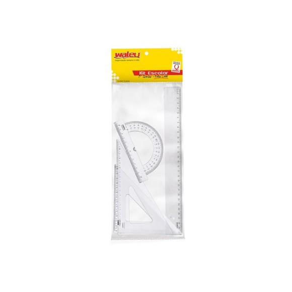 O kit escolar 1º grau New Line Waleu possui conjunto de réguas especiais e essenciais no dia a dia do aluno seja em fase escolar / O kit é composto por : 1 régua 30cm, 1 esquadro de 45º, 1 esquadro de 60º e 1 transferidor de 180º / Fabricado em poliestireno / Possui 3mm de espessura / Registro Inmetro: 004395/2020, OCP0006.