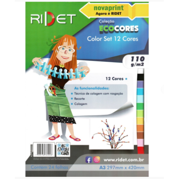 Detalhes: Bloco Ecocores Color Set / Funcionalidades: técnica de colagem com rasgação, recorte e colagem / Embalagem contém 24 folhas / 12 Cores / Formato: A3 (297mm x 420mm) / Gramatura: 110g/m².